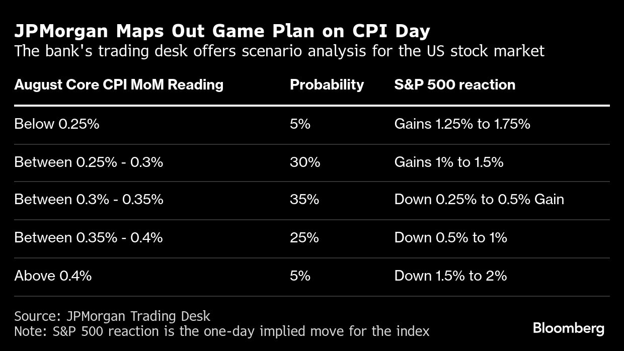 Options traders are betting the S&P 500 will post a modest swing of nearly 0.7% in either direction following the CPI report, according to Stuart Kaiser, Citigroup Inc.'s head of US equity trading strategy. That's less than the average realized CPI day move of 0.9% over the past year, and below expectations for the next jobs report on Oct. 3. And Kaiser thinks the implied move is high.