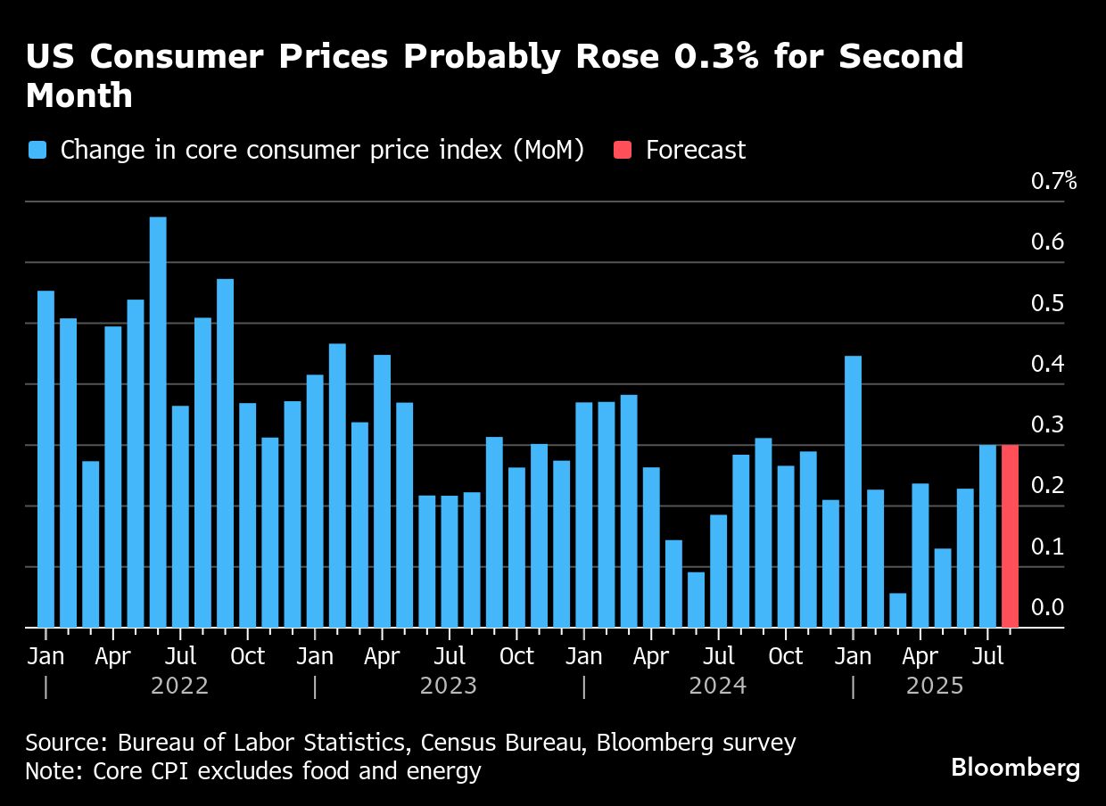 Consumer price data due Thursday will offer insights on the extent to which tariffs made their way to American households in August. Core CPI, a measure of underlying inflation excluding food and fuel, probably rose 0.3% for a second month, according to the Bloomberg survey median estimate.