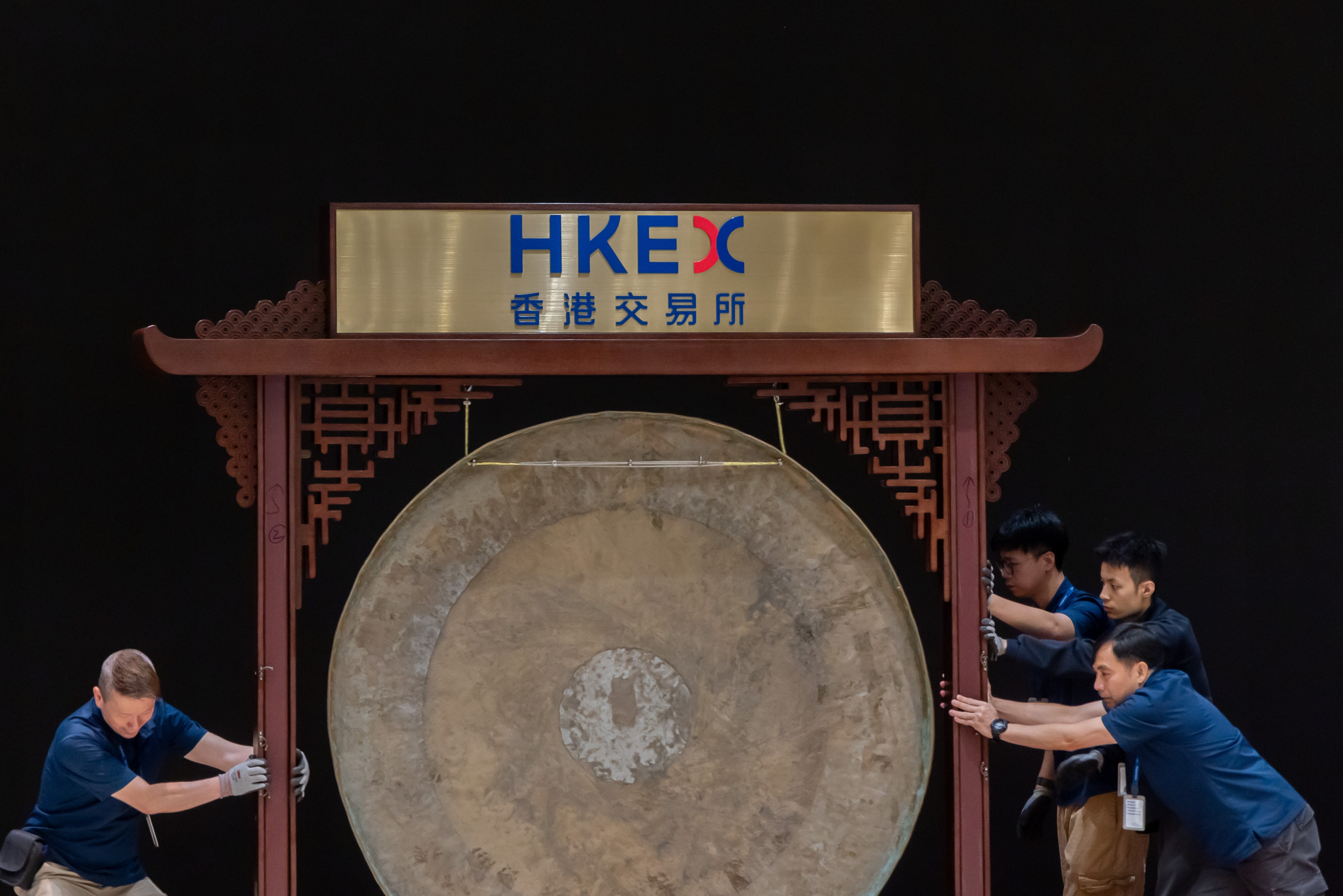 Workers move a gong during the listing ceremony at the Hong Kong Stock Exchange in Hong Kong, China. (Photographer: Paul Yeung/Bloomberg)