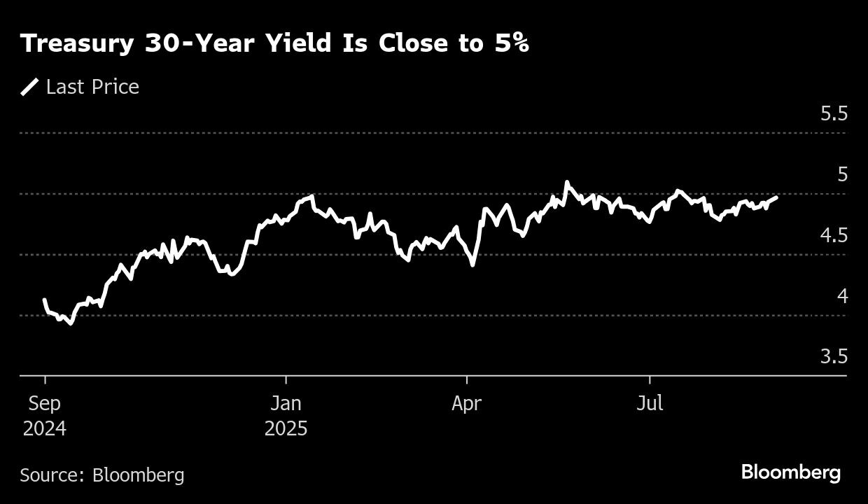 Things weren't that much easier in the bond market, where 30-year Treasury yields approached 5%. The rate on long-dated UK bonds rose to the highest since 1998 amid concerns about the fiscal outlook. A slew of US corporate-debt sales also weighed on trading.