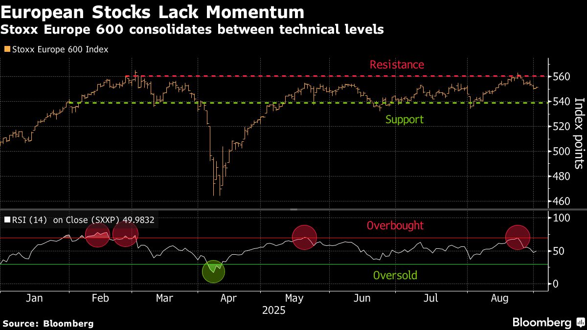 Goldman Sachs Group Inc. expects the Stoxx 600 to climb about 2% to 560 by year-end, supported by improving growth prospects, light positioning, and relatively attractive valuations. JPMorgan Chase & Co. strategist Mislav Matejka sees the recent loss of momentum as a “healthy” development.