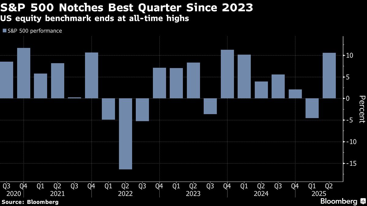 Following a roughly 25% surge from its April lows, the S&P 500 notched its best quarter since December 2023. The US equity benchmark topped the 6,200 milestone on Monday, with technology shares leading the charge. Apple Inc. climbed the most among megacaps. Oracle Corp. jumped on a cloud-services deal worth $30 billion a year. Big banks gained after passing the Fed's annual stress test, setting the stage for payouts.