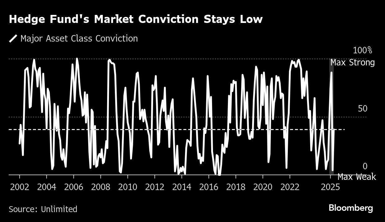 So-called market conviction, a gauge of hedge funds' confidence in pursuing a particular investment strategy, is recovering somewhat after swooning to near its lowest in decades, according to data provided by Bob Elliott, a former top executive at Bridgewater Associates Ltd. Positioning across major asset classes — including currencies, bonds and commodities — remains weak after having fallen at the end of March into the bottom 10th percentile relative to levels since 2000.