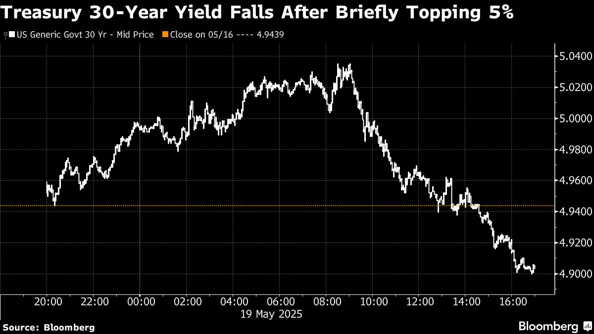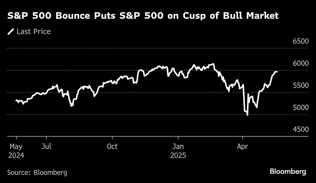 After a morning slide that topped 1%, the S&P 500 rose for a sixth straight day to close on the brink of a bull market. Several Wall Street strategists said any pullback could be a buying opportunity amid momentum fueled by the recent easing of global trade tensions. Treasuries also bounced across the curve, following a selloff that briefly drove 30-year yields above 5%.