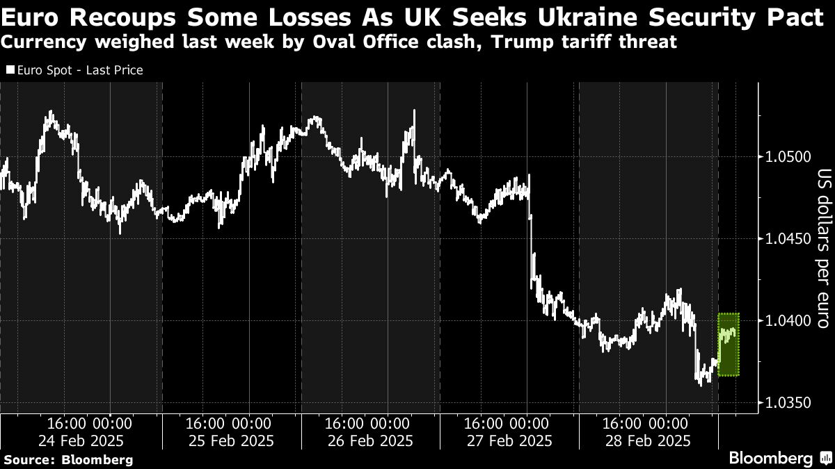 Markets are starting the week with another geopolitical one-two punch as European leaders pledge to increase defense spending and assemble what Britain called a “coalition of the willing” to secure Ukraine. That follows an Oval Office clash between Trump and Ukrainian President Volodymyr Zelenskiy over the prospects of a ceasefire with Russia without American security guarantees.