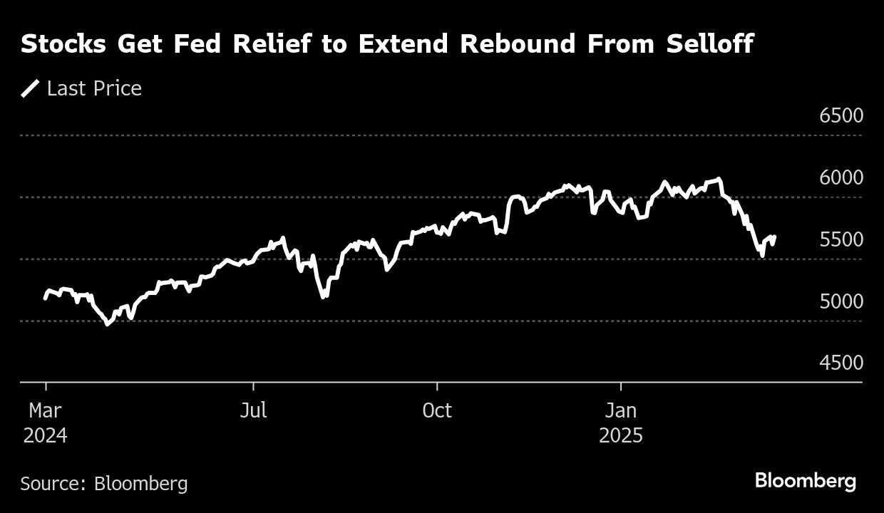 After central bankers held monetary policy steady, as expected, Powell was measured in his assessment of how the president's actions might shape the economy, citing the potential for the impact of tariffs on inflation to be “transitory.” The jump in stocks, the biggest for any Fed day since July, follows a bruising four-week stretch in which the S&P 500 slid into a correction. Treasuries saw an abrupt reversal, with two-year yields sinking below 4%.