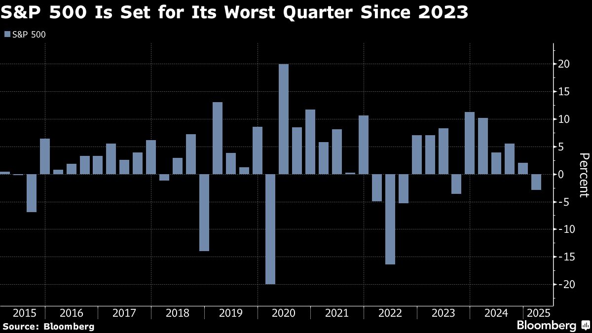 Just days before the end of a quarter that's set to be the worst for the S&P 500 since 2023, the gauge slipped anew. Car giants from Toyota Motor Corp. to Mercedes-Benz Group AG and General Motors Co. got hit. AppLovin Corp. sank on a short report from Muddy Waters. Megacaps were mixed, with Apple Inc. up and Nvidia Corp. down. In late hours, Lululemon Athletica Inc. gave a gloomy outlook. The bond market flashed concerns about inflation as short-dated Treasuries outperformed longer ones.
