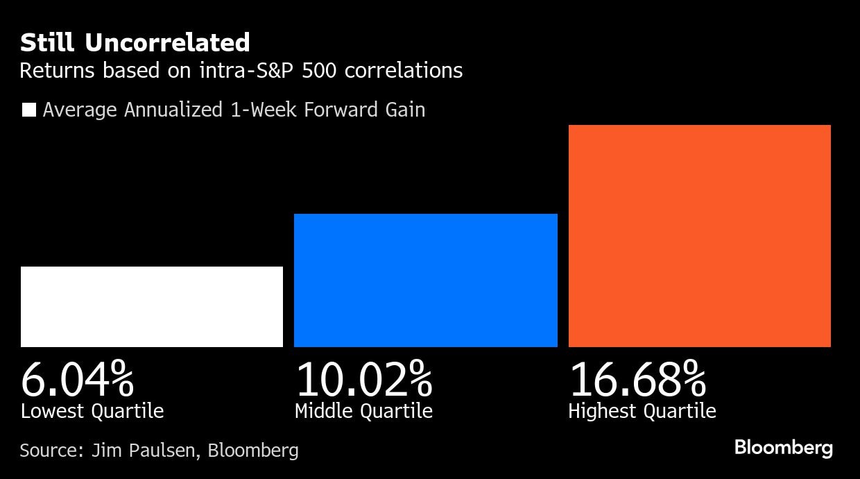 The correlation between individual S&P 500 members — measuring the degree to which they move in tandem — stands near the lowest level in 25 years even after rising this month, according to data compiled by independent strategist Jim Paulsen.