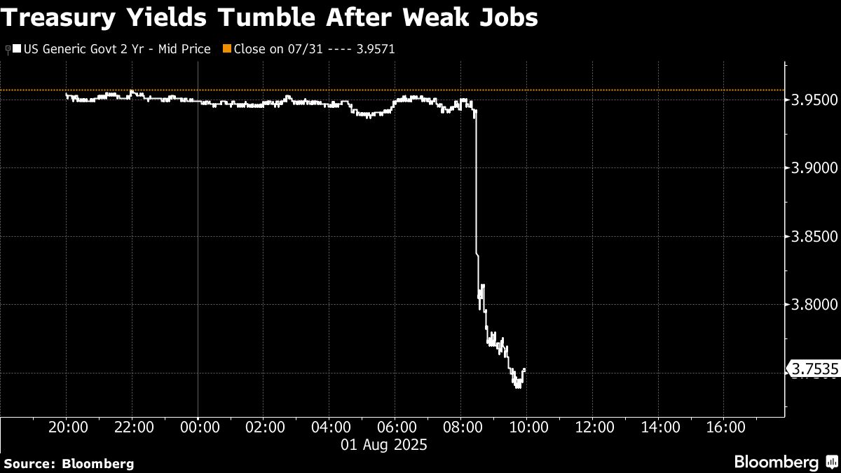 Treasuries jumped as weak jobs and manufacturing data bolstered bets on Federal Reserve rate cuts. Stocks extended their weekly slide, with investors also weighing the impacts of President Donald Trump's sweeping tariffs on the economy.