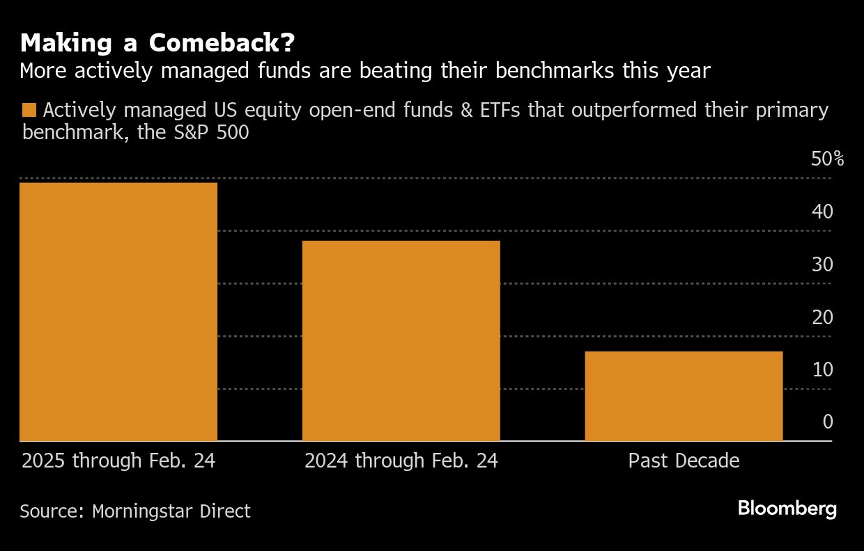 That under-allocation is turning out to be a blessing in disguise. With the so-called Magnificent Seven faltering this year, active investors' are seeing a performance boost: Roughly 49% of actively managed mutual funds and exchange-traded funds that compare themselves to the S&P 500 are beating the index in 2025, according to Morningstar Direct. That's up from 38% during the same time last year and far above the 17% outperformance level of the last decade.