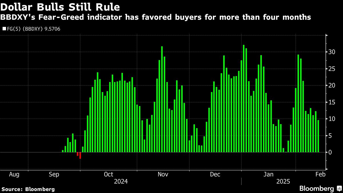 Despite the greenback's slide on Thursday, the long-term view on the dollar remains positive, according to the Bloomberg dollar index's fear-greed gauge.