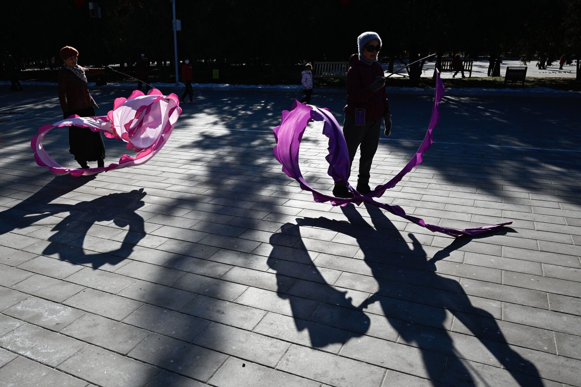 People dance with long ribbons at a park in Beijing, China. (Source: Bloomberg)