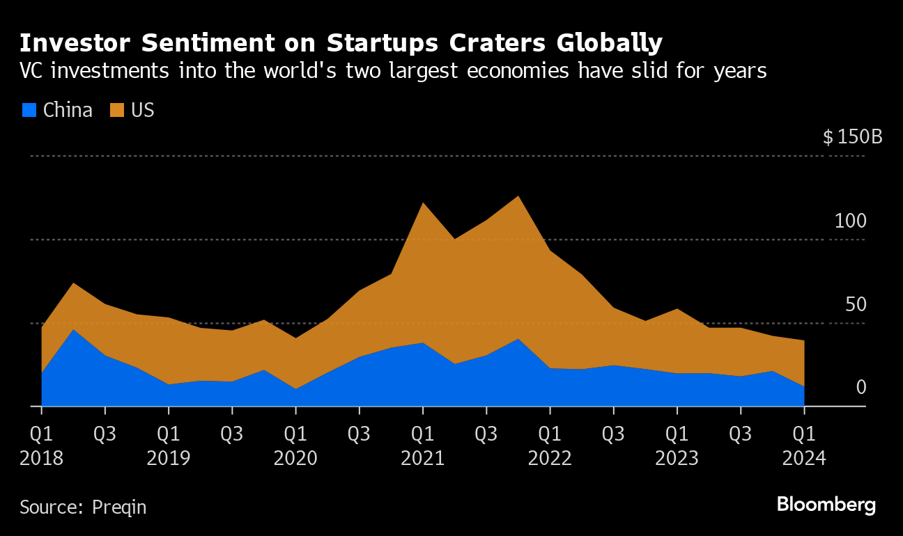 China's 40% decrease helped pull the market down, while the US saw a 29% drop, according to data collected by research firm Preqin. The overall worldwide haul by startups shrank to $57.8 billion in the first three months.