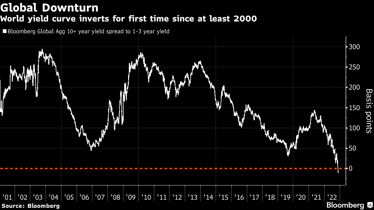 The global yield curve inversion comes as bonds enjoy a rebound rally on prospects that a slowing economy will spur policymakers to slow or even halt rate hikes. The Global Aggregate index has gained 5% in November, heading for its biggest monthly gain since 2008.