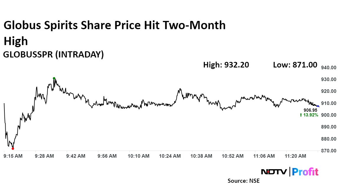 Share price of Globus Spirit rose as much as 17.09% to Rs 871 apiece, the highest level since Nov. 13. It pared gains to trade 14.66% higher at Rs 912.90 apiece, as of 11:27 a.m. This compares to a 0.50% advance in the NSE Nifty 50.
