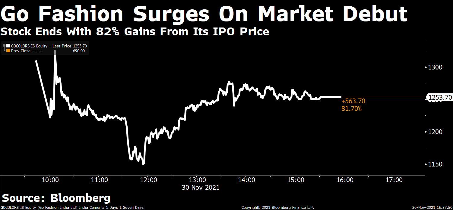Shares of Go Fashion (India) Ltd. ended higher on debut after investors piled into the women's bottom-wear maker's initial public offering.