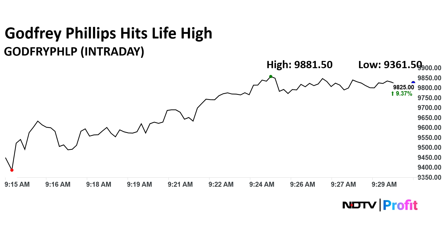 Godfrey Phillips India Ltd. share price advanced 10% to a record high of Rs 9,881.50 apiece. The share price was trading 9.16% higher at Rs 9,830 apiece as of 9:42 a.m., as compared to 0.36% decline in the NSE Nifty 50 index.