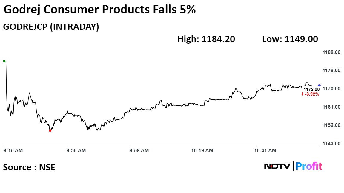Shares of Godrej Consumer Products declined 5.81% before paring loss to trade 4.12% lower at 11:15 a.m., compared to a 0.43% advance in the Nifty.