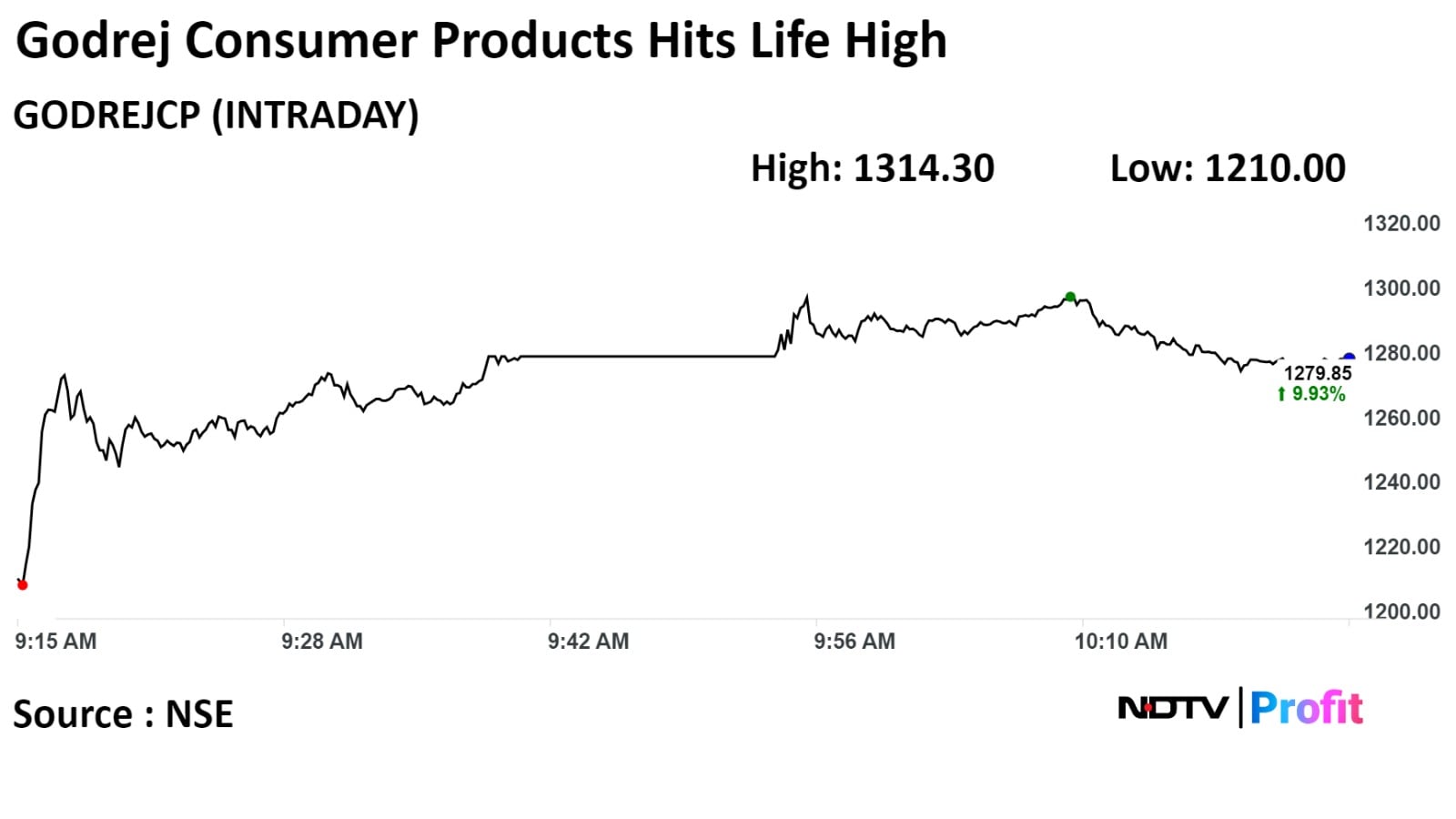 Shares of Godrej Consumer Products Ltd. surged nearly 13% to an all-time high on Thursday after its profit in the third quarter met estimates.