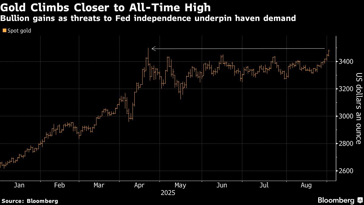 “Gold and silver have suddenly sprung to life as both fundamentals and technicals aligned,” said Saxo Capital Markets Pte. strategist Charu Chanana, adding that worries about the Fed's future underpinned the gains. “On top of that, key resistance levels around $3,450 for gold and $40 for silver were breached, triggering momentum buying.”