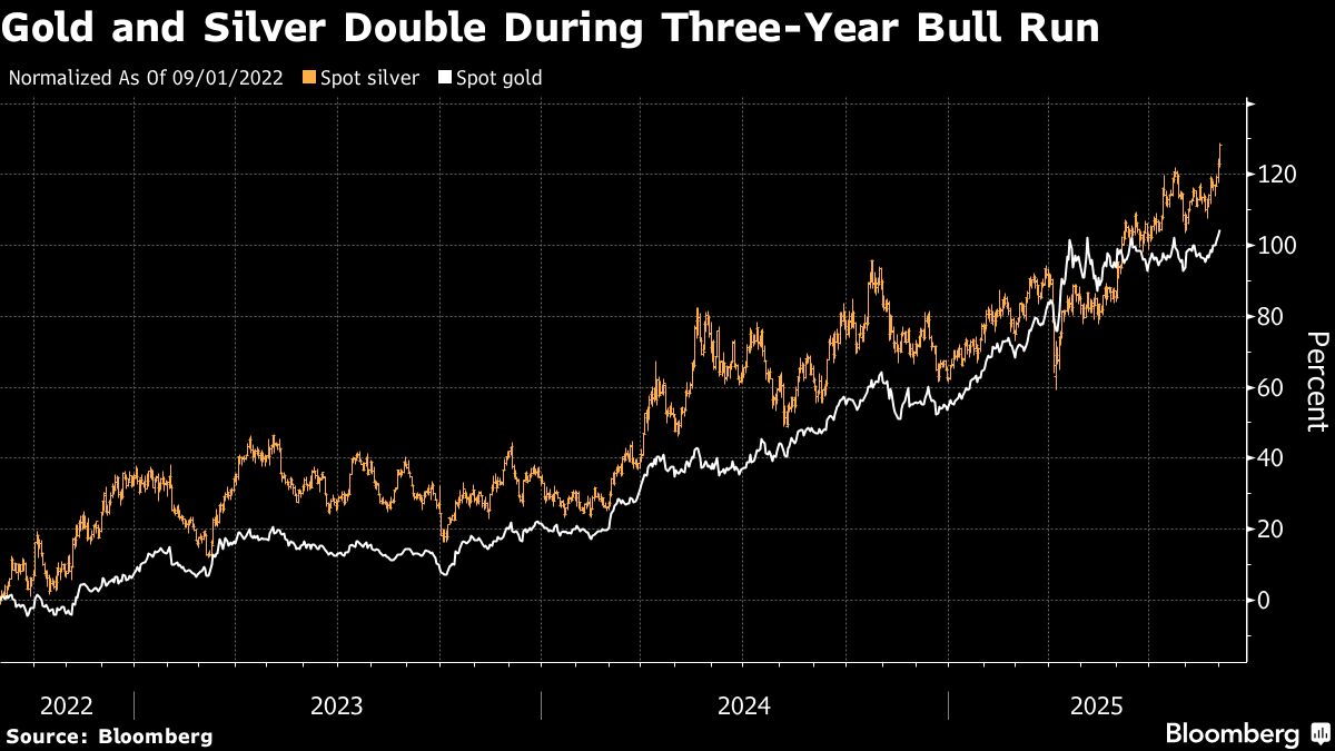 Spot silver rose as much as 2.6% to $40.7599 an ounce — taking gains this year to about 40% — while gold jumped as much as 1.2% to trade just below its April record above $3,500 an ounce. Both metals have more than doubled over the past three years, propelled by mounting risks in the spheres of geopolitics, business, and global trade.