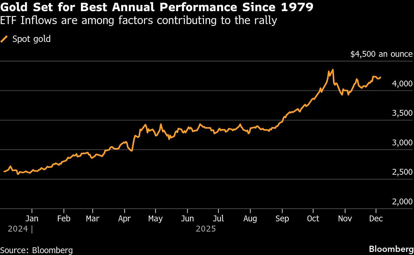 Total holdings by ETFs increased to 3,932 tons at the end of November, a sixth consecutive month of growth, according to data from the World Gold Council. With more than 700 tons of this total purchased in 2025, inventories are set for their biggest-ever year of growth, the WGC said in a report.