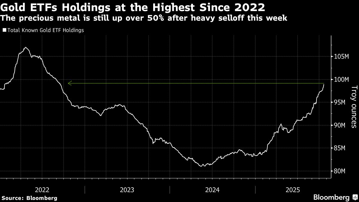 Total gold ETF holdings climbed to 98.9 million troy ounces as of Tuesday, according to global data compiled by Bloomberg. That's the highest since Sept. 16, 2022.