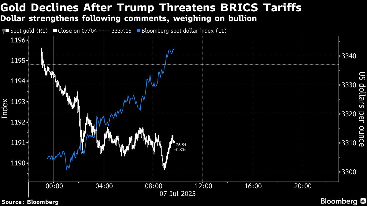 Bullion dipped as much as 1.1% an ounce after President Donald Trump signaled an additional 10% levy would apply to countries aligned with the BRICS group of nations, which gave the US dollar a lift. A stronger dollar typically weighs on gold, making it more expensive for buyers in other currencies.