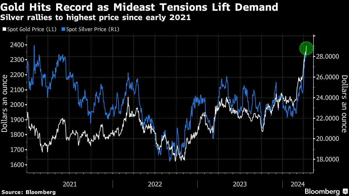 Elevated tensions in the Middle East and Ukraine and ongoing problems in China's economy are adding to bullion's allure as a haven asset. Meanwhile, some investors have been seeking safety on bets that inflation may stick higher in the long run, underpinning gold's run. Central banks buying, led by China, have added some bullish momentum.