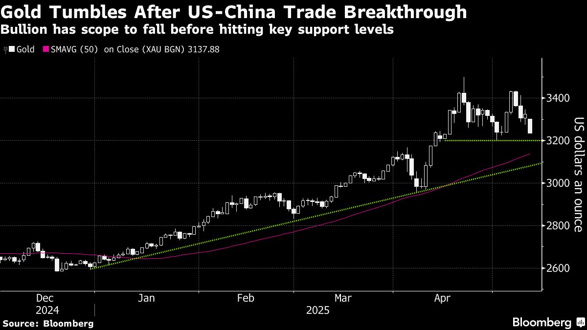 Bullion's losses accelerated on Monday after the announcement, with prices falling as much as 3.2% to around $3,220 an ounce. The dollar extended gains — making gold more expensive for most buyers — following a joint statement from both nations that said the combined 145% US levies on most Chinese imports will be reduced to 30%, while the 125% Chinese duties on US goods will drop to 10%.