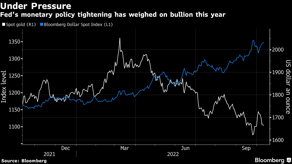 The relentless rate hikes by the US central bank have sent gold down almost 19% from this year's high set in March. The traditional haven has been out of favor with investors, whose sales from exchange-traded funds have driven much of the decline.