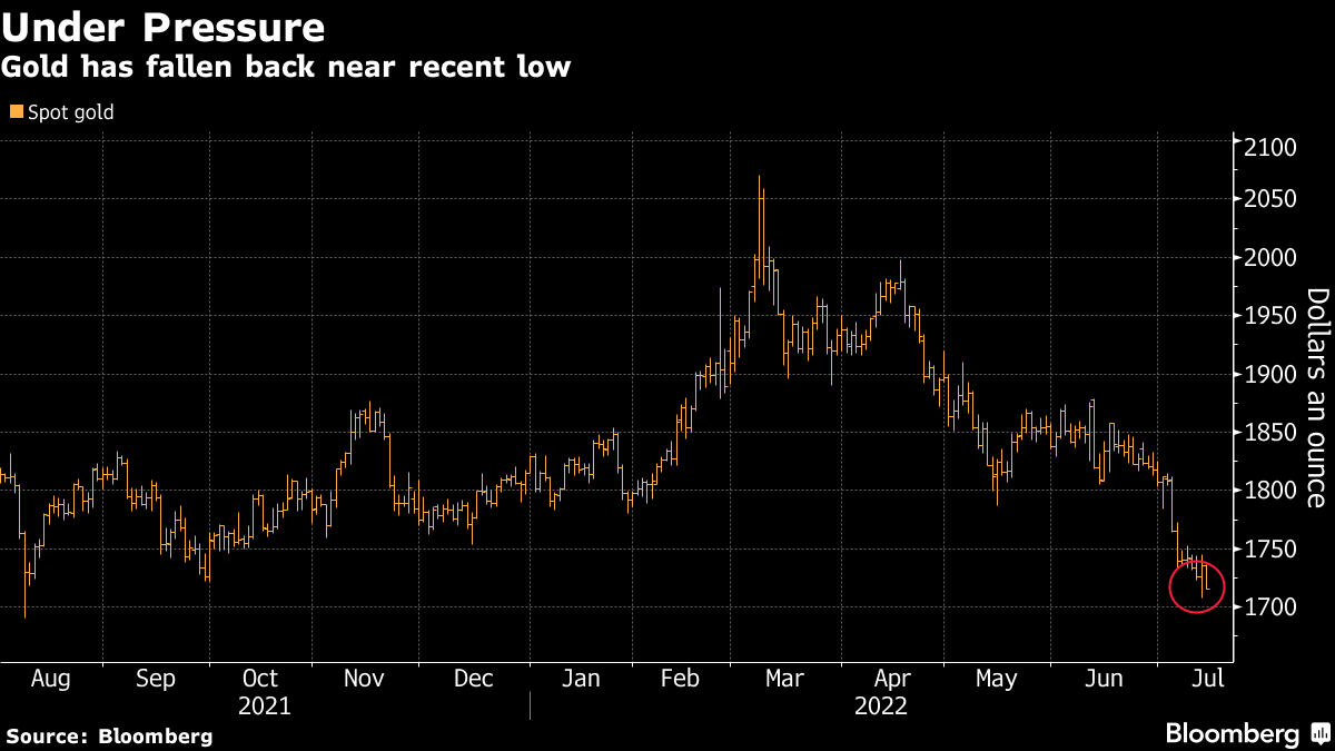 (Bloomberg) -- Gold dropped back toward an 11-month low as investors again turned to the dollar as a haven asset amid expectations for more aggressive US monetary tightening.