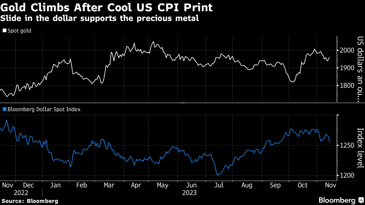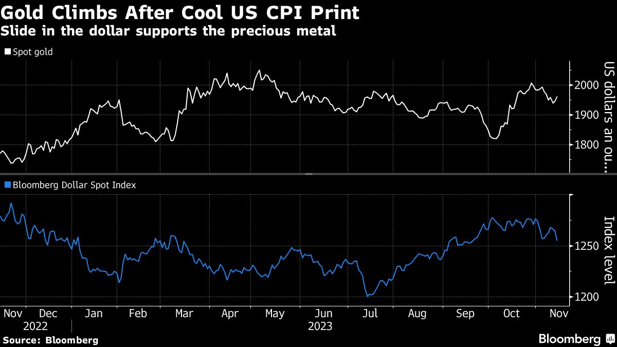 The consumer price index was little-changed in October, while the figure excluding food and energy rose less than expected, Bureau of Labor Statistics data showed Tuesday. The dollar and Treasury yields dropped significantly following the print, as traders essentially wiped out the chance of another rate hike. That boosted gold as much as 1.2%, the most on an intraday basis since Oct. 27.