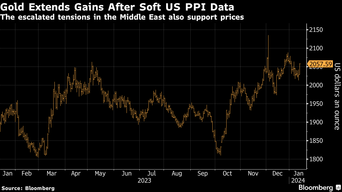 (Bloomberg) -- Gold jumped the most in a month after soft US producer prices data amped up expectations of interest-rate cuts, while US-led airstrikes on Houthi rebel targets in Yemen stoked haven demand.