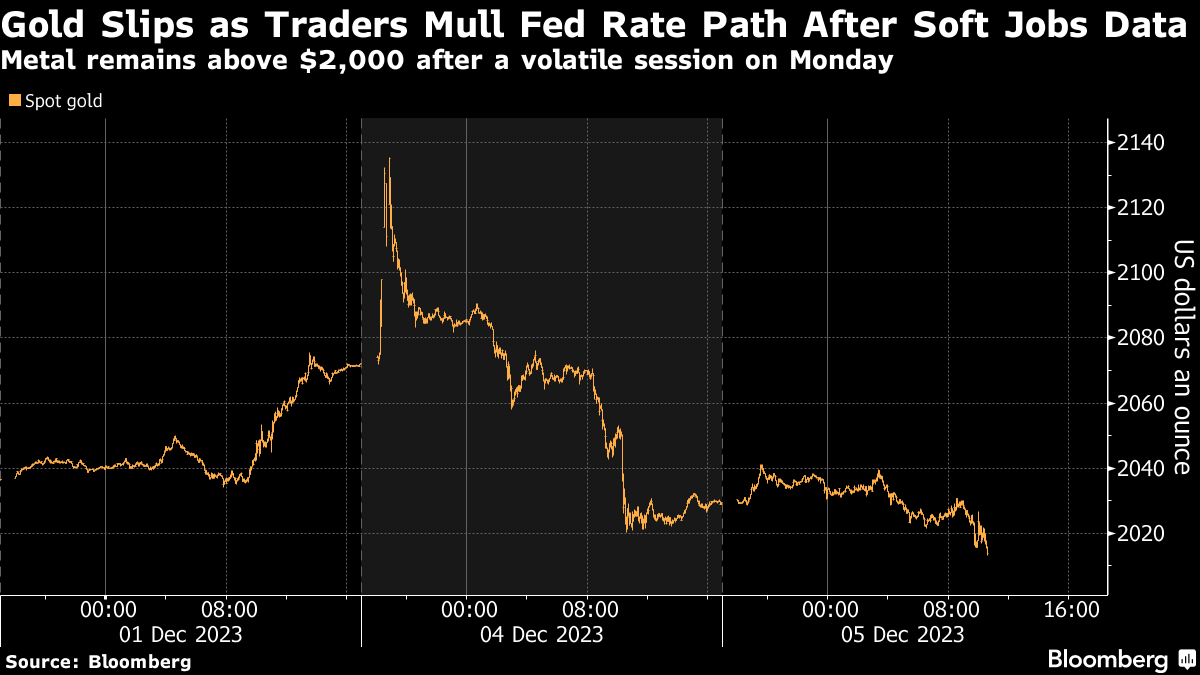 The precious metal still traded near $2,015 an ounce Tuesday after a volatile session the prior day that saw it reach a record high before pulling back as traders reined in bets that the Fed was nearing a pivot to rate cuts. Investors will be closely monitoring more jobs readings over the next few days for clues on the central bank's next steps.