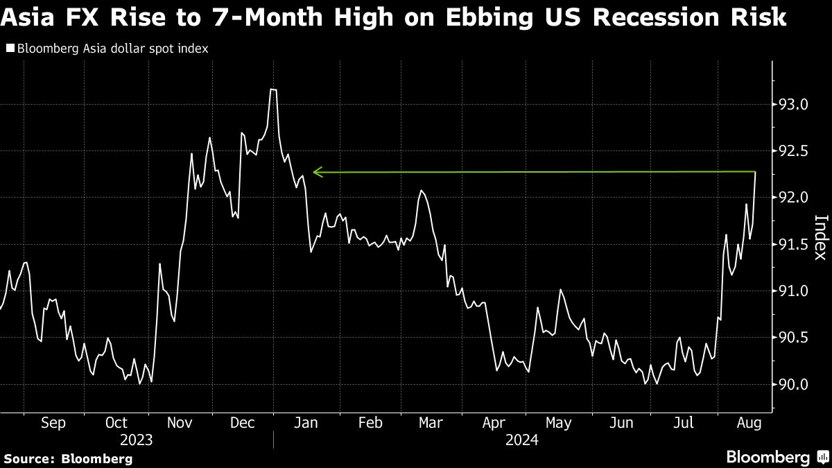(Bloomberg) -- Asian currencies rallied to the highest in seven months as ebbing US recession concern, bets on Federal Reserve rate cuts next month and an improving domestic backdrop lifted sentiment in the region.