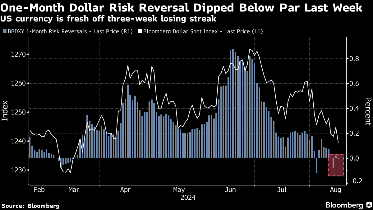 The Bloomberg Dollar Spot Index slipped 0.3% as traders waited for Fed Chair Jerome Powell's speech at Jackson Hole symposium later this week for clues on rate cuts. A gauge of aggregate demand for bullish call options over bearish puts on the US currency showed traders were split on what direction to hedge against, having paid up for bets on a stronger dollar for much of the year.