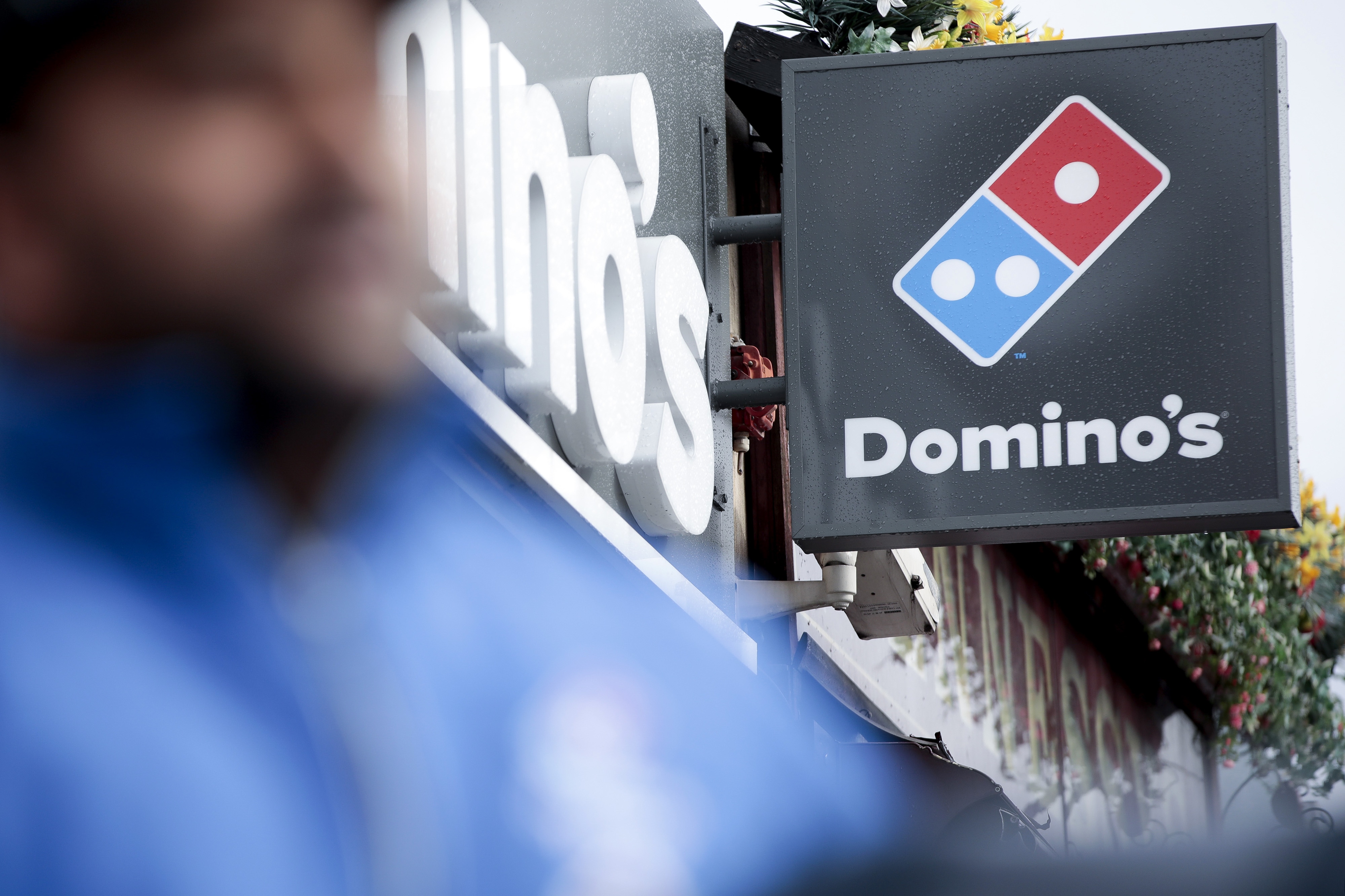 A Domino’s Pizza sign stands above the entrance to a Domino’s Pizza store (Photographer: Jason Alden/Bloomberg)