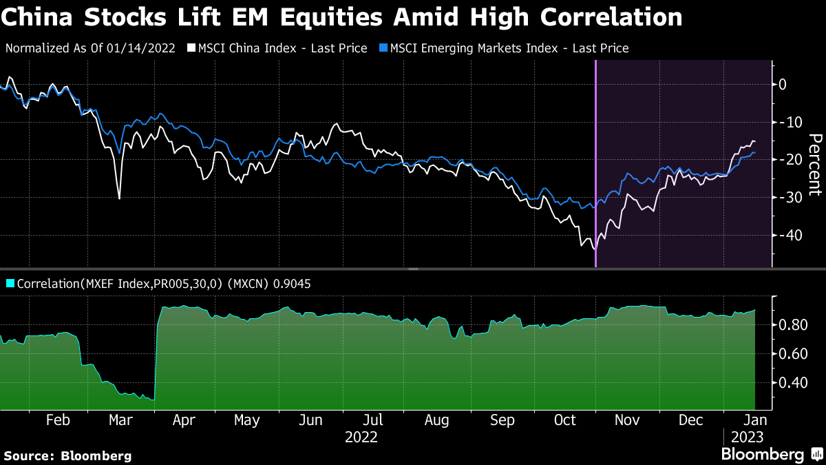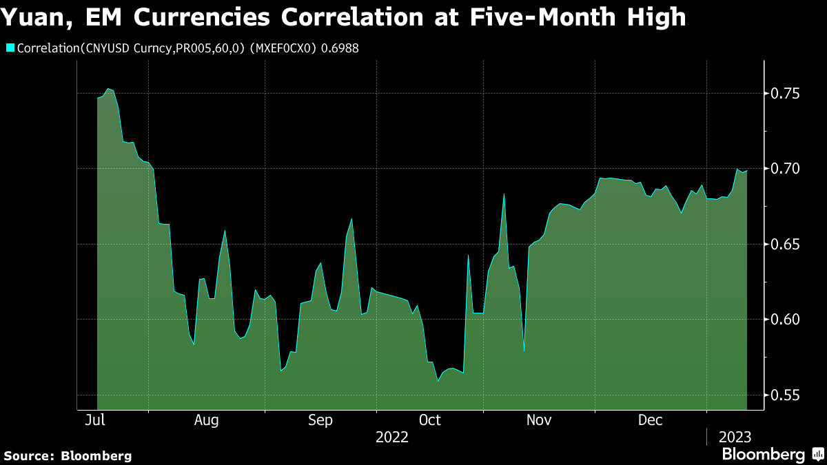 A 60-day correlation gauge between the yuan and emerging-market currencies has risen to 0.70, the highest in five months. The reopening could be especially lucrative for Thailand's baht and the South Korean won, both beneficiaries of Chinese tourism. The Chilean peso will also climb amid rising Chinese demand for copper.