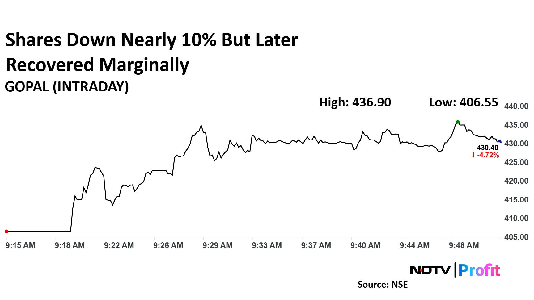 Gopal Snacks share price fell nearly 10% to Rs 406.55 apiece. It later pared losses to trade 3.70% lower at Rs 435 apiece.