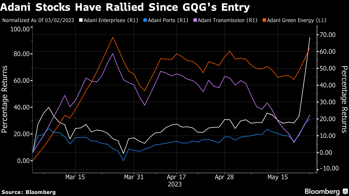 In March, GQG acquired almost $2 billion worth of shares in four of Adani's firms from a family trust. That initial investment in the beleaguered conglomerate bolstered the tycoon's companies after they were accused of “brazen” stock-price manipulation and corporate fraud by New York short-seller Hindenburg Research, causing Adani Group at one point to shed more than $150 billion in market value.