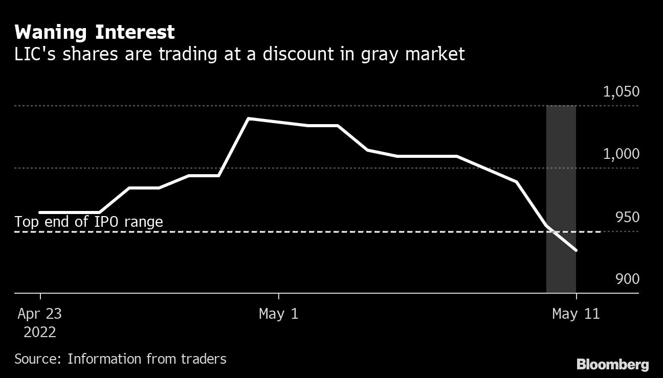 Shares of LIC are trading at a discount of about 15 rupees to 949 rupees ($12.28), the top end of the marketed range, in the gray market on Wednesday, traders told Bloomberg News. This compares with a premium of as much as 85 rupees at the start of the month. In the unregulated market, investors bet on the price at which the shares of a company will debut on bourses to profit from any sizable jump.
