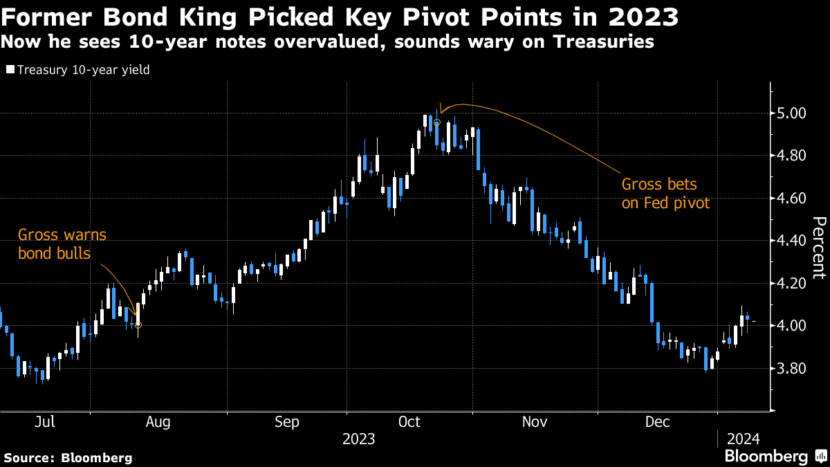 Gross earned the moniker of “bond king” while at Pacific Investment Management Co., the firm he co-founded in the early 1970s. He made millions late last year after a big bet the Federal Reserve would pivot toward interest-rate cuts for 2024 benefited from a sizzling bond rally. That came after he warned in August that bond bulls were misguided, just before a two-month rout that sent yields to 16-year highs.