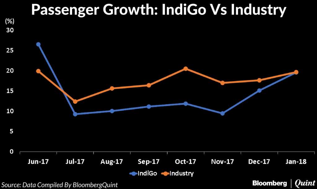 Grounded planes and subsequent delays in aircraft addition due to engine trouble is likely to restrict IndiGo's passenger growth. The airline grew slower than the industry during the second half of 2017, recovering to industry-level growth only in January.