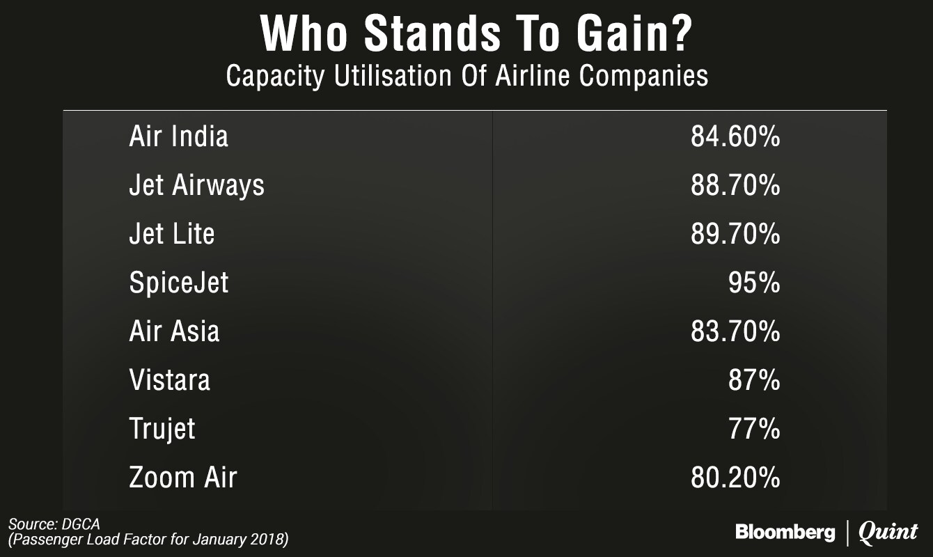 For now, IndiGo's loss is likely to result in gains for Air India Ltd., Jet Airways Ltd. and a few smaller operators which are running at lower capacity utilisation. SpiceJet Ltd., the closest competitor of IndiGo is less likely to benefit as it is already running at high capacity utilisation.
