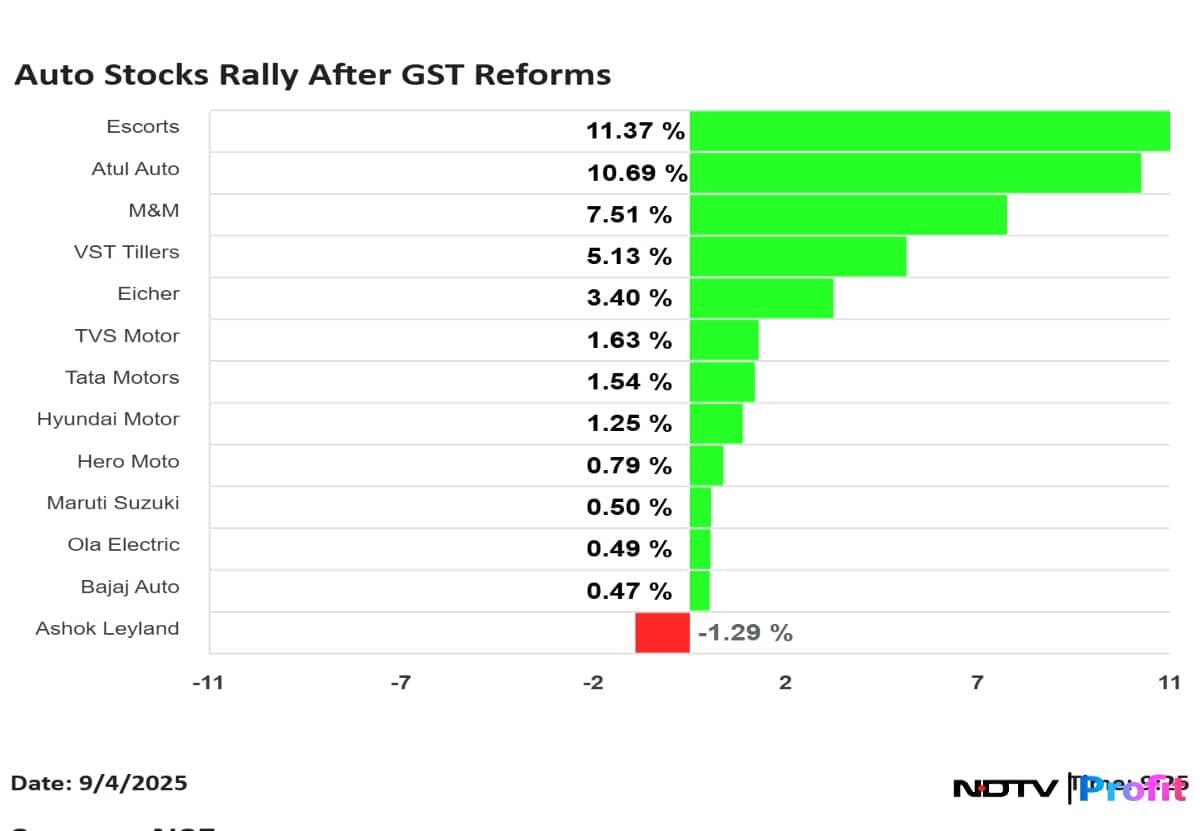 Most auto stocks rallied on Sept.4, led by Escorts Kubota Ltd., Mahindra And Mahindra Ltd. and Eicher Motors Ltd., after the Goods and Services Tax Council, chaired by Finance Minister Nirmala Sitharaman on Wednesday declared a new tax scheme.