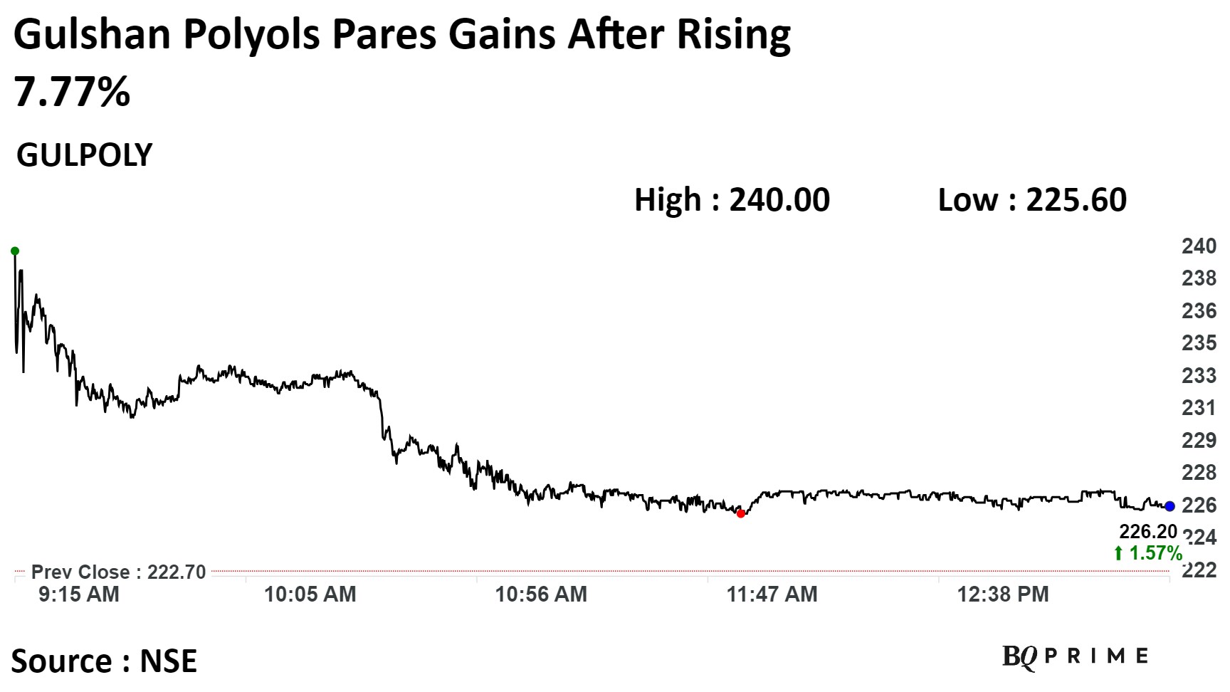 Gulshan's stock rose as much as 7.77% during the day on the NSE to Rs 240 apiece, the highest since July 14. It pared gains to trade 1.75% higher at Rs 226.60 apiece, compared to a 0.56% advance in the benchmark Nifty 50 as of 12.55 p.m.