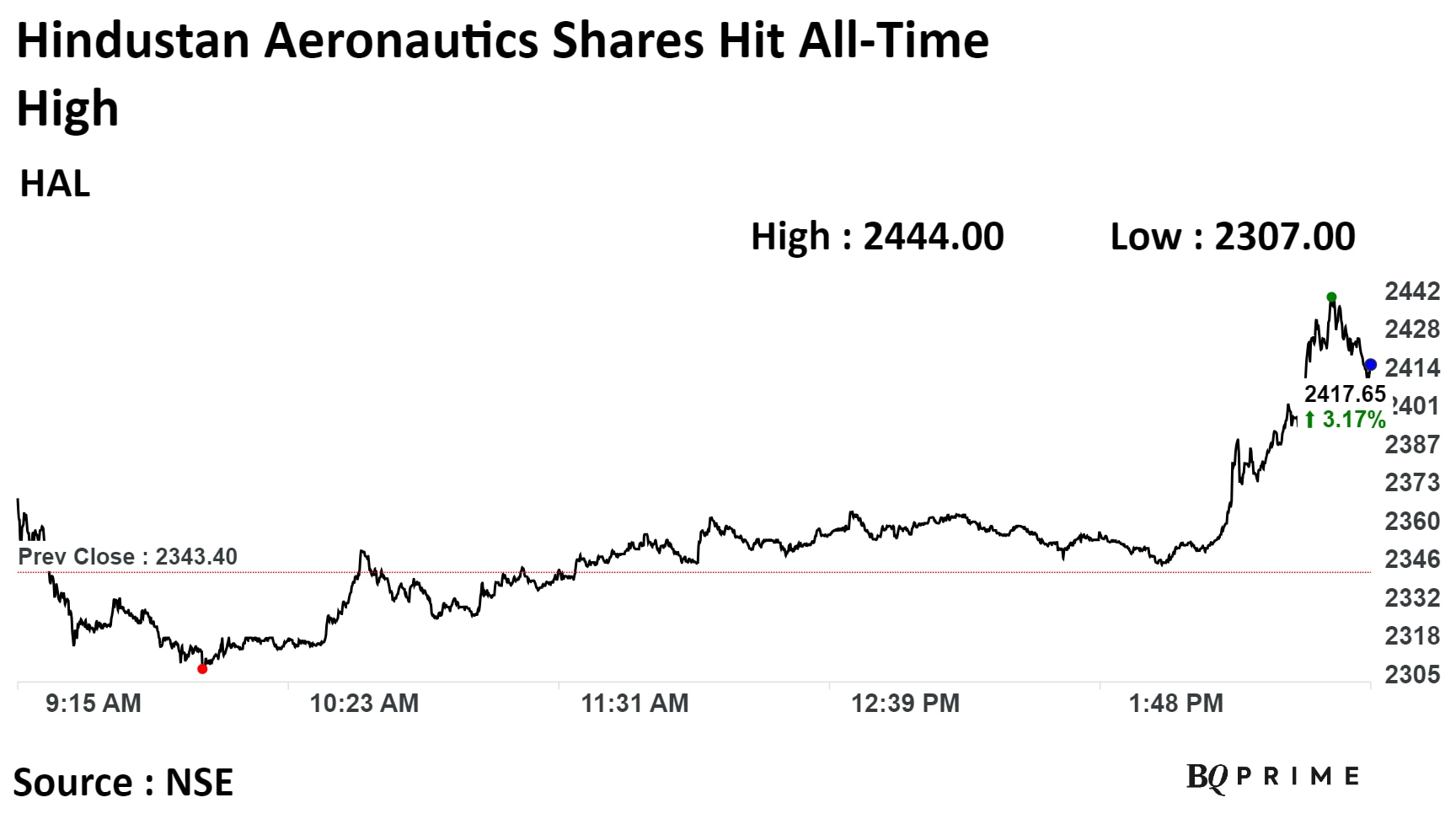 HAL's stock rose as much as 4.3% during the day to Rs 2,444 apiece on the NSE. It pared gains to close 1.6% higher at Rs 2,379.80 apiece, compared to a 0.18% advance in the benchmark Nifty 50.