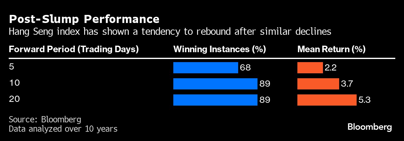 (Bloomberg) -- Hong Kong stocks may be poised for a near-term rebound after the aggressive selloff on Wednesday, if history is a guide.