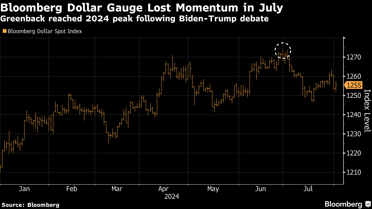 The markets aren't solely reacting to the electoral outlook. Fed Chair Jerome Powell acknowledged this week the central bank could pare rates in September, also pushing investors to favor Treasuries and doubt the dollar. That signaling is likely to annoy Trump, who recently told Bloomberg Businessweek a rate cut just weeks before the vote is something officials “know they shouldn't be doing.”